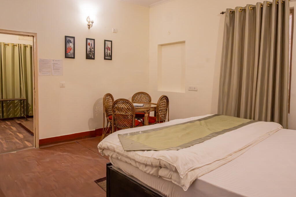 Whether you are visiting for leisure, business, or religious reason, the room gives you a mesmerizing view of mountains. It has everything you require for a comfortable stay. The extra bed and a dining table gives a homely feeling. The room is perfect for relaxation or work. The morning sun gives you a rare feeling of natural environment. Whether you are a solo traveler or visiting with your family, friends or relatives, the Mountain View Rooms are the best to meet your requirements.